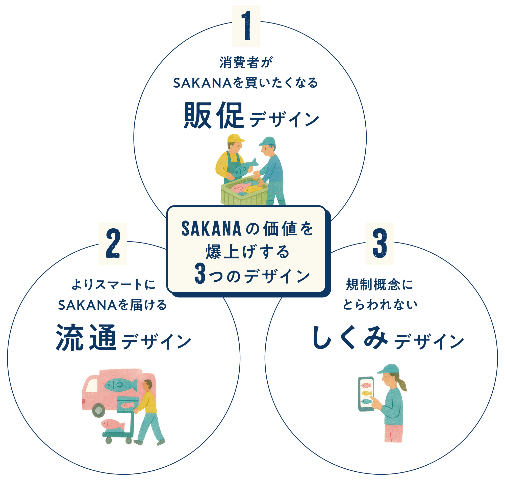 販促物・パッケージ・情報設計・売場づくり・ストーリーづくりなど、すべての顧客接点を“SAKANAの価値が伝わる体験”として創出します。